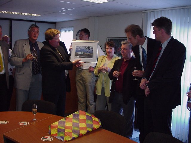 Het kado was een ingelijste schets van hoe het uiteindelijke resultaat van de te bouwen sporthal eruit gaat zien... Ik moet zeggen.. dat zag er fraai uit.... Maar dat valt gelukkig nu redelijk snel met eigen ogen te aanschouwen.. En mocht je niet in staat zijn om zelf naar de bouwplaats te komen kijken, kom dan gewoon weer eens kijken op deze site. Zodra de bouw start zijn we van plan om met hoge regelmaat foto's op de site te zetten waarmee de bouw gevolgd kan worden.